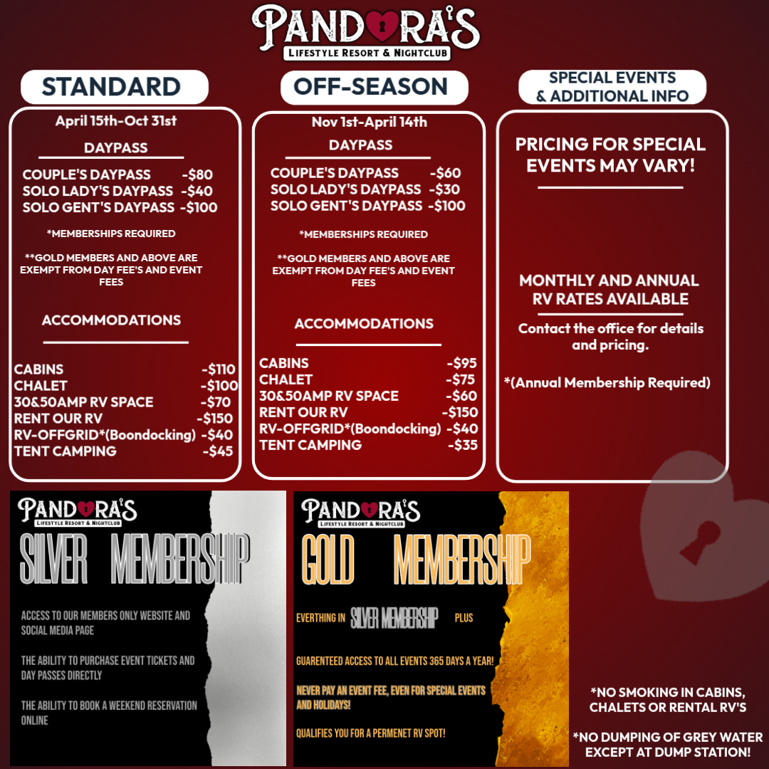 Introducing Pandora's Resort: under new ownership and fully transformed from Pandora's Forest. We're open and excited to showcase our improvements! The Grand Re-Opening on Memorial Day was a hit and resort updates include a the tantalizing new Red Room play space, clubhouse upgrades, renovated cabins, chalets, bathhouse, and outdoor showers. All amenities are open 24/7 for your enjoyment. More enhancements are happening daily. Join us for themed parties every weekend and check out the ongoing improvements at Pandora's Resort. Make a reservation now and experience it firsthand.